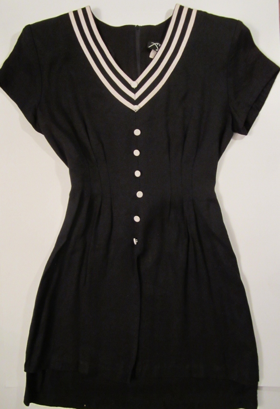 Cute Black and White spin on the sailor type jumper. The dress features 8 mock front buttons, 3 white stripes along the V-neckline, moderate shoulder pads, and back zipper closure. Also features small pleats at waistline with sash-style belt to accentuate the waist.