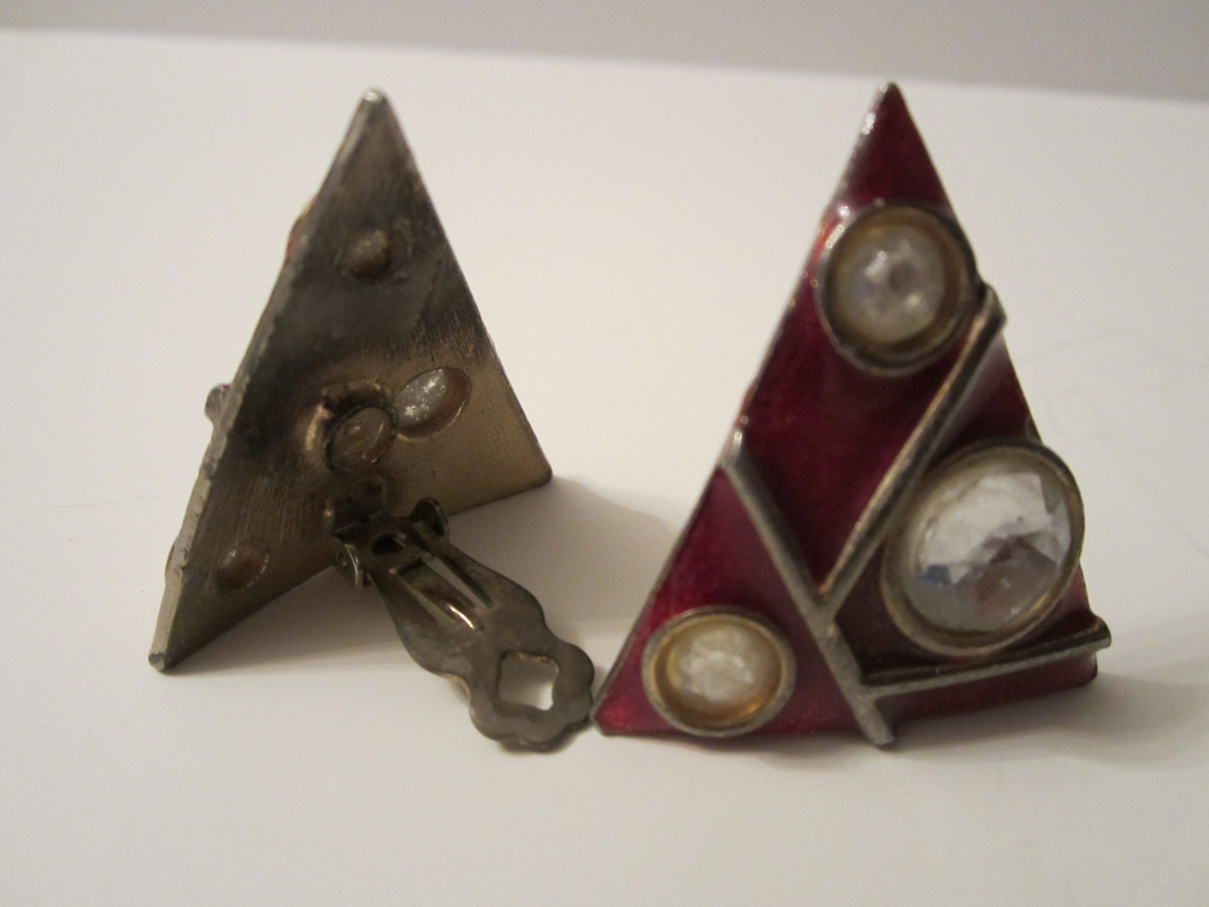Metallic Red Triangular Clip-On Earrings with multi-sized gems trimmed in gold and silver (plated); branch like feature on surface.