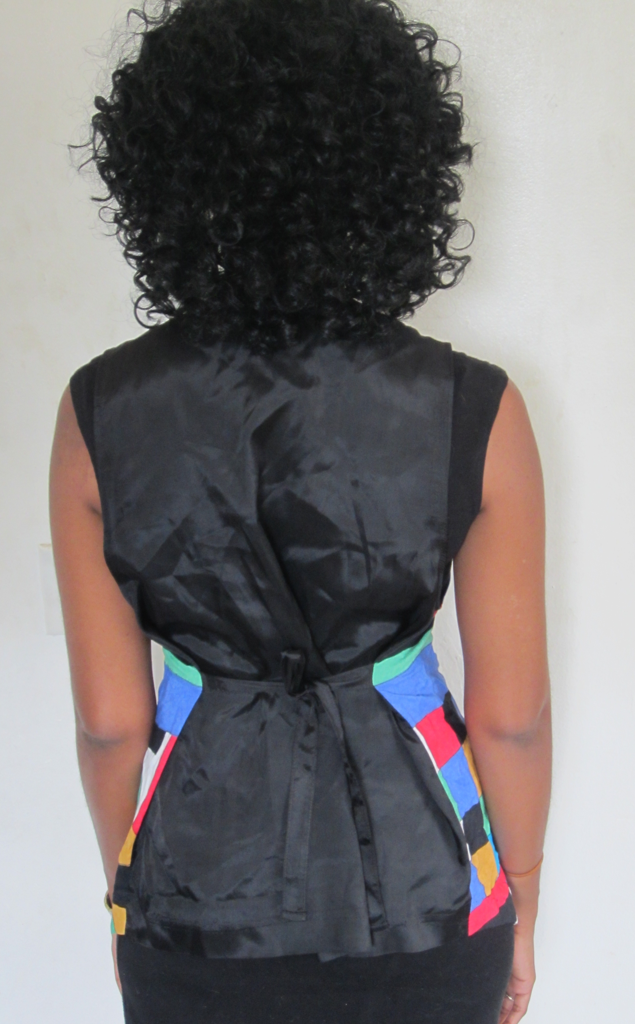 Size: 6 Medium: Cotton with Silk back. Oversized vest with black square buttons on multi-colored print.