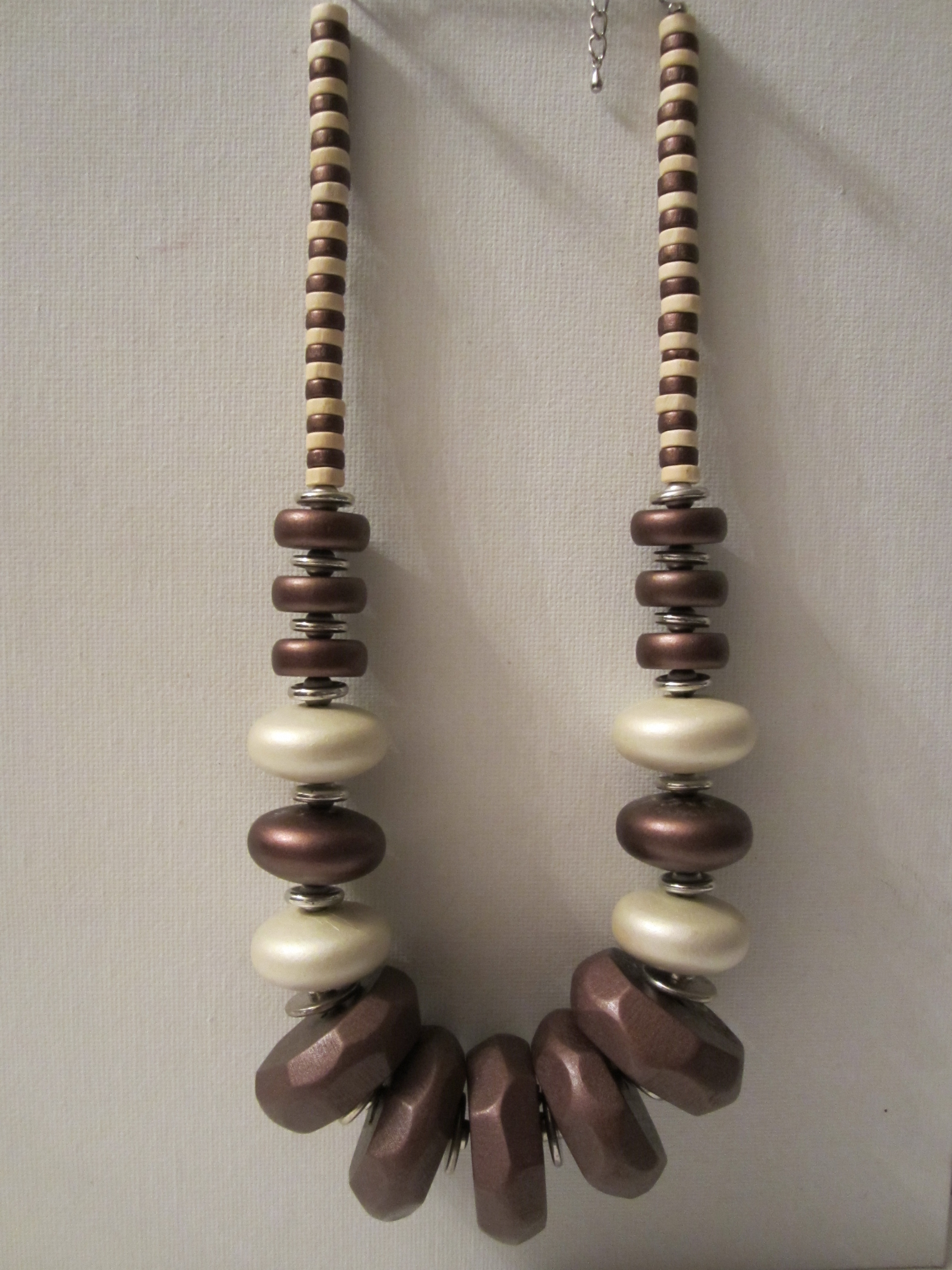 Bold chunky necklace with a mixture of alternating over-sized bronze and opal pebbles , and silver coin shaped pieces.