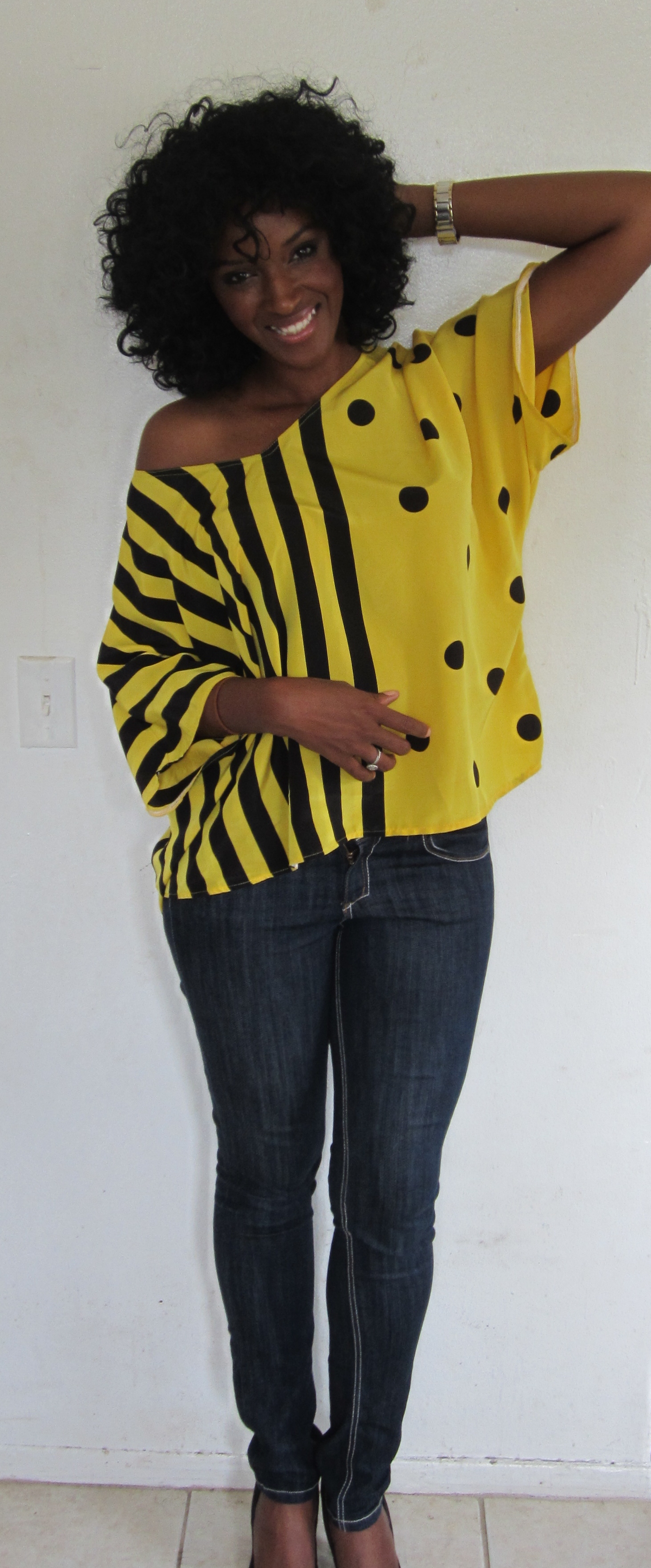 Oversized black stripes and polka dots on yellow ground. Black stripes on one half and black polka dots on opposite side