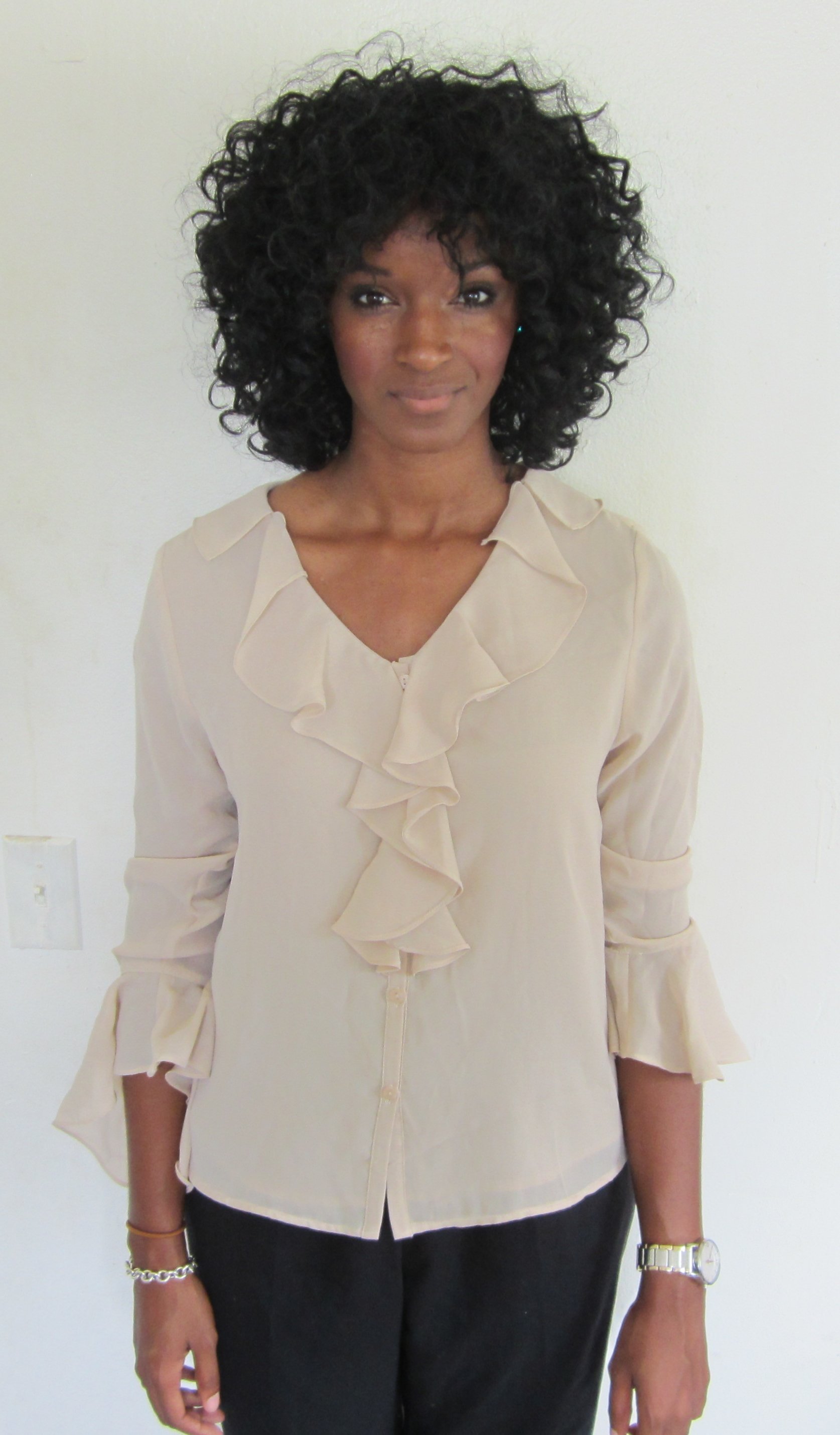The falls muted palette brings this beautiful sheer ruffle blouse. Pair it with black slack, tweed pencil, or even denim...romantic look ensues. V-Neck button-down closure.