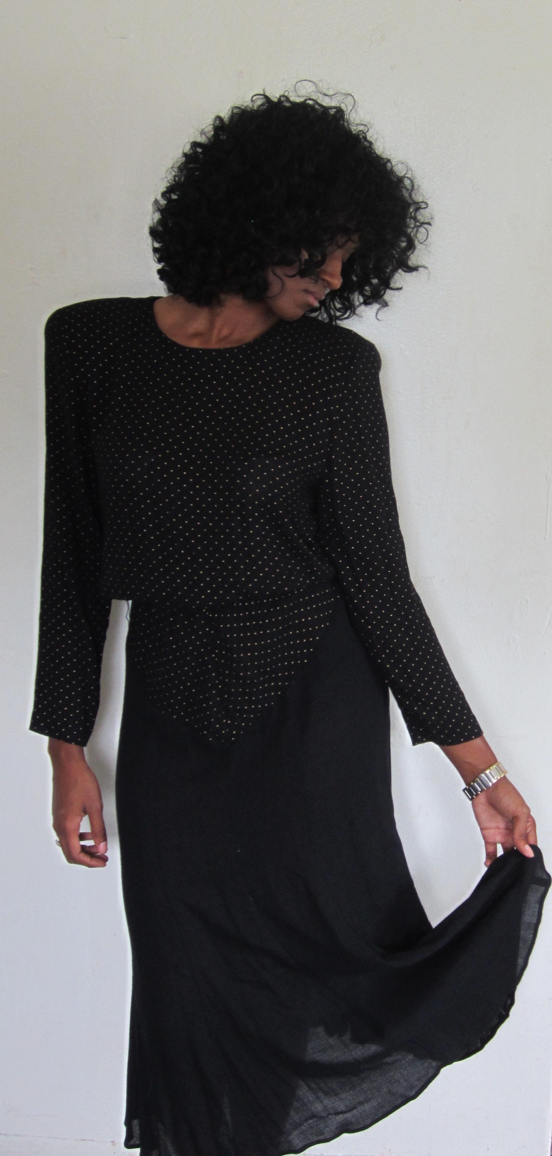 Casual Black Dress with Western-Style Cut pronounced by mini gold polka dots. Thread Belt loops on side, shoulder pads sew-in
