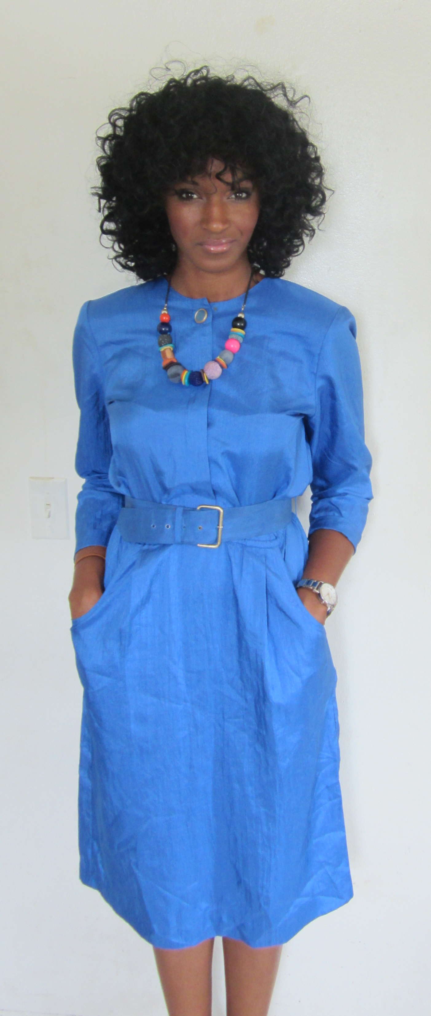 Midi-Length dress with matching belt inched at the waist in a bold blue. Moderate shoulder pads sewn-in. Hidden button closures, with the exception of the top button; that’s a teal blue trimmed in gold. Cinched waist and two front pockets.