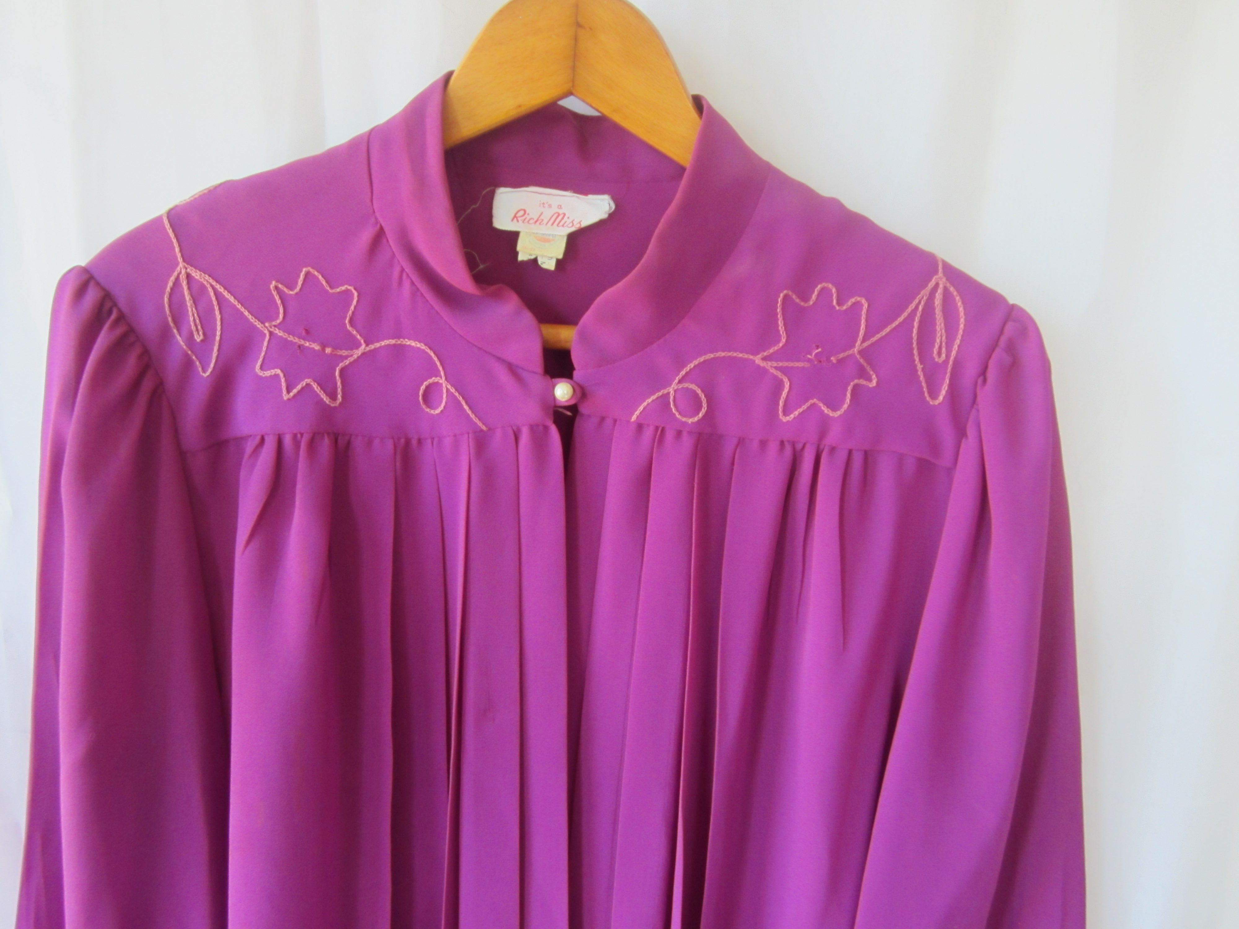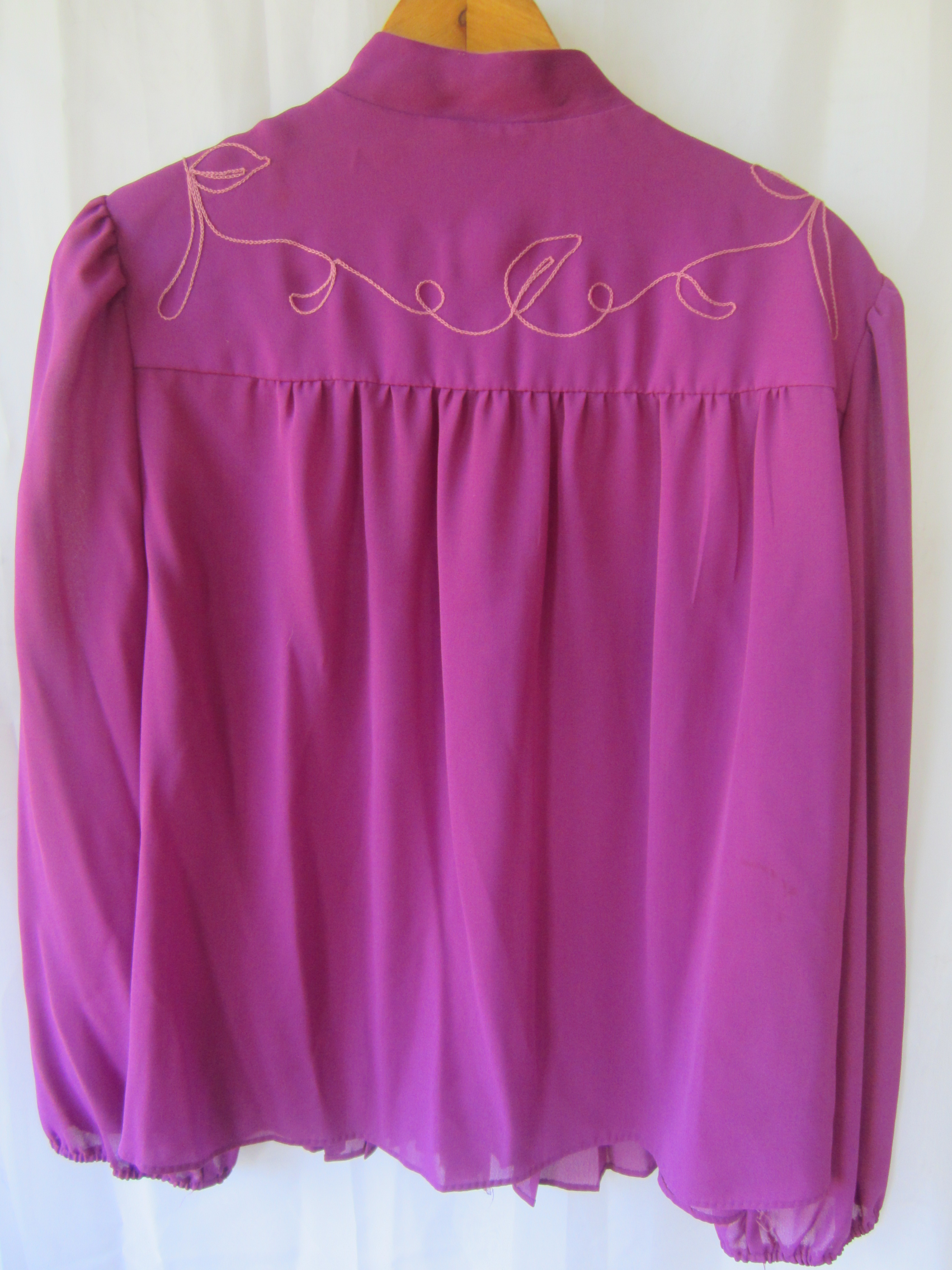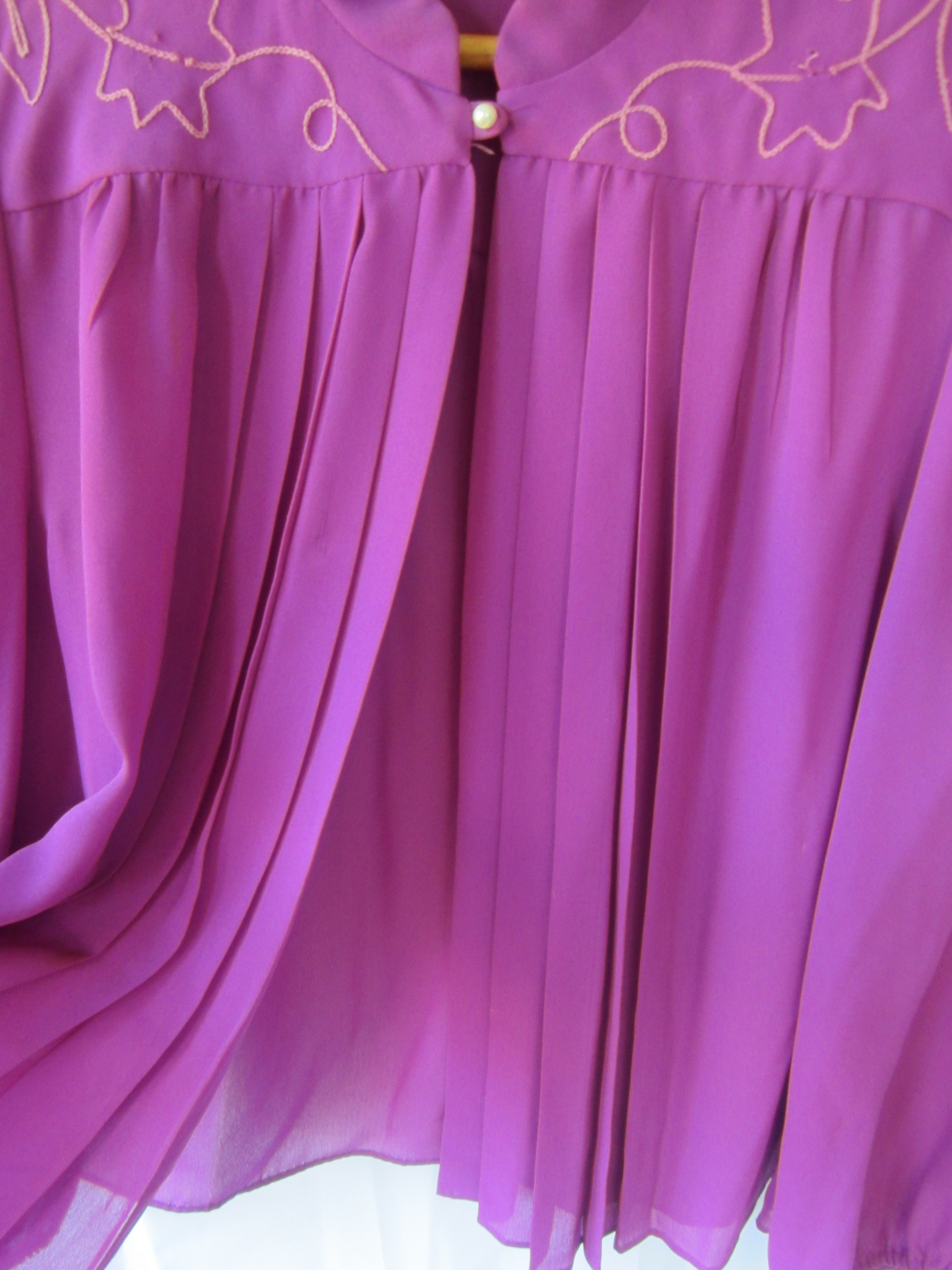 This orchid purple top is adorned with tan floral stitching on collar bone to give it a mid-western flair. Sheer with a one pearl button closure.