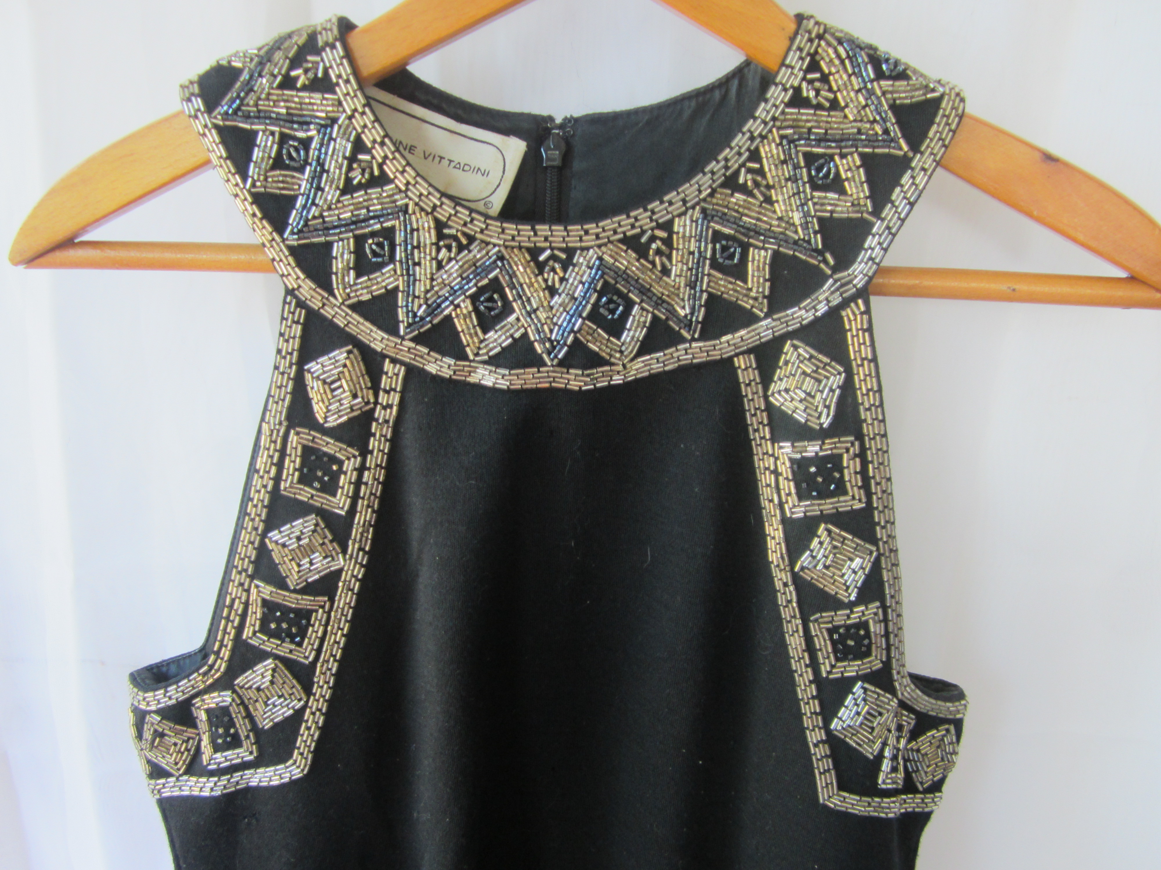 Beautiful archived Adrienne Vittadini designer dress. Embellished with Grecian style beading on the halter style top. Zipper closure in back with fish hook for extra securing.