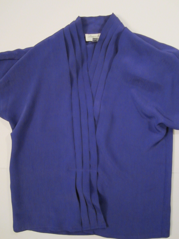 Unique Features: Knife pleats at the neckline and leading down the hidden button closure. Soft constructed shoulder pads.